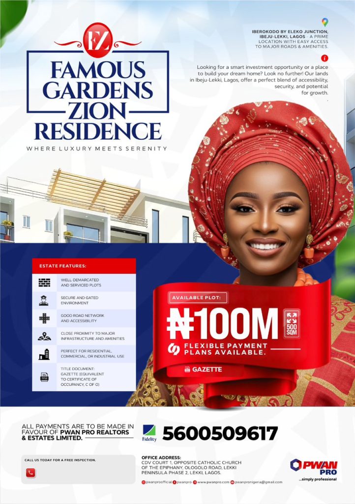 Looking for a smart investment or the perfect place to build your home? Famous Gardens – Zion Residence, located at Iberokodo by Eleko Junction, Ibeju-Lekki, offers a blend of accessibility, security and long-term growth. This prime location provides easy access to major roads and essential amenities.